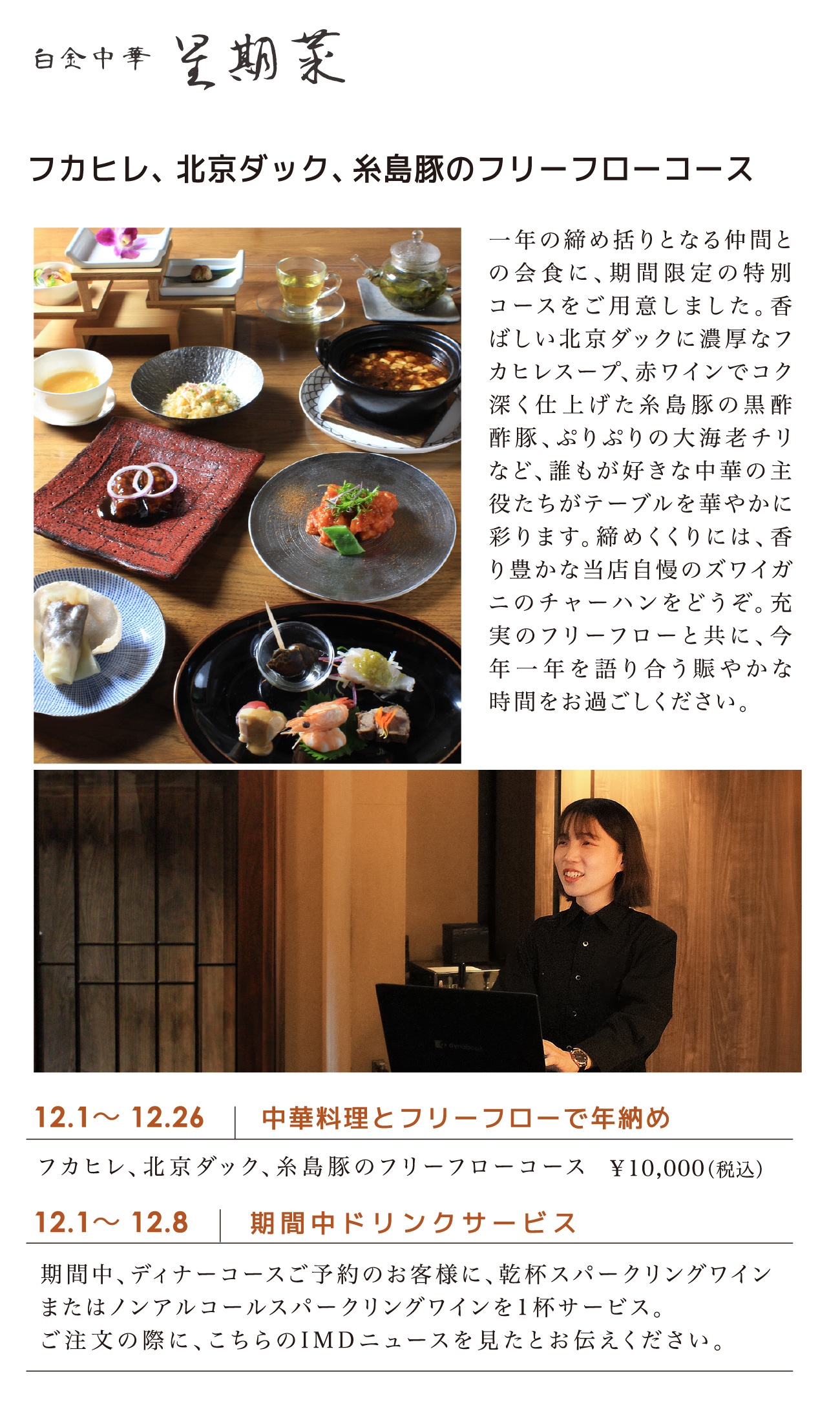 季節の前菜 本日のスープ 点心二種 海鮮料理 肉料理 本日の麺または飯